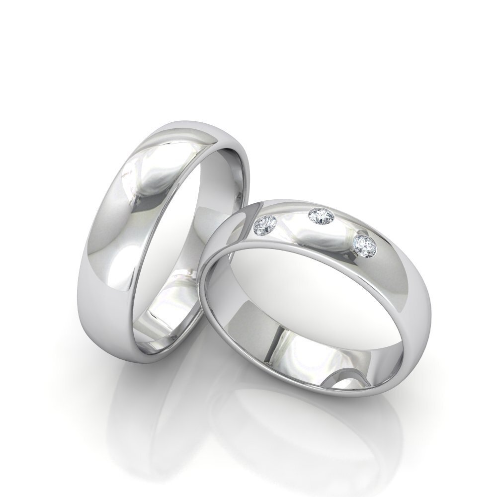 This is a configurable ring set. Both the width and the profile can be chosen. The set shown has the following specifications: Weight around 14 grams 18K white gold. 3 * 0.028 carat diamond. G color. VS clarity. Excellent cut. Width 5mm, Height 1.50mm, 3 Diamonds / 1.9mm diameter. Luxurious packaging included. We can make a free customized 3D drawing based on this design, the ring sizes and your wishes. Please contact us below. Also if you require advice from our experts.